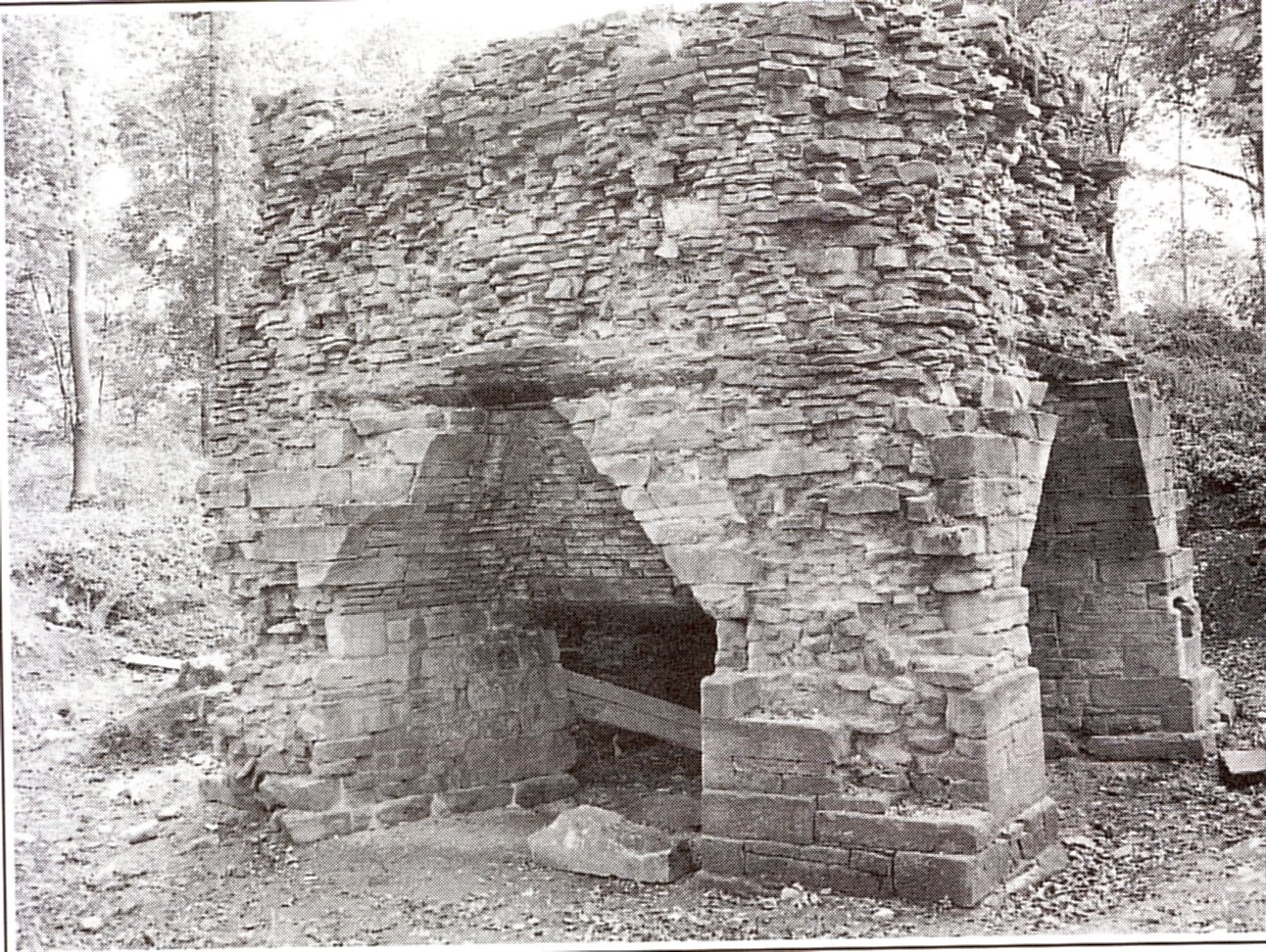 SURVIVALS OF The local woodlands have long been associated with iron making. Now buried beneath the M1 is the site of Rockley Smithies, a medieval bloomery where water power was used to power the blowers and hammers. Here local iron and charcoal were used to heat and hammer the iron into a ‘bloom’ of wrought iron. Nearby, however, is a rare survival. The Rockley blast furnace which stands in the woods near Rockley Abbey Farm, was built between 1698 and 1704 to smelt the local iron ore. It was worked until the 1740s by the Spencer syndicate of ironmasters of Cannon Hall, Cawthorne. The blast furnace, which was first introduced to this country from the continent in 1496, used the strong draught produced by a long chimney to achieve a high temperature. It was therefore possible to actually melt the iron and run it off at the bottom into sand beds to make ‘pigs’ of cast iron. The furnace used charcoal from the local woods as fuel. It was in 17098 that Abraham Derby developed the method of smelting iron with coke at Coalbrookdale but this method was only slowly adopted in this area and it was not until about 1770 that coke was first used in South Yorkshire. The Rockley furnace may well have been brought into use again in about 1790, fuelled by coke, to produce gun castings.