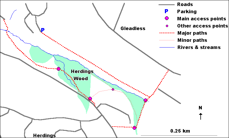 LOCATION Description Herdings Wood (grid reference SK371843) is split into two blocks joined by a narrow wooded strip. It forms part of the network of woodlands and adjacent open meadows, which is such a characteristic feature of this part of Sheffield. To the south-west of the wood, between this and Rollestone Wood, lies Herdings Meadows (grid reference SK374834), an area of open grassland with wildflower meadow and some scrub, wet flushes and small plantations. Immediately adjacent to the northern edge of the wood is Nether Spring Open Space (grid reference SK377836), an interesting area consisting of a mixture of habitats, including small relic fields divided by hedgerows; wooded stream banks; rough grassland; and scrub. VISITING BY