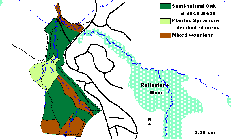 The distribution of different woodland types in Lees Hall Wood can