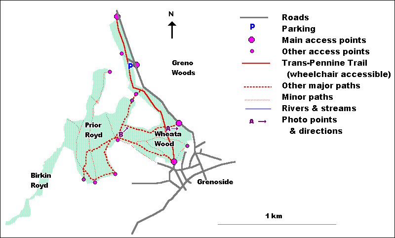 Grenoside and Oughtibridge. Paths Both the path along the eastern edge of Prior Royd and the path leading from here downhill to the wood's south-west corner are generally wide and well surfaced and the first of these is also mostly flat. However other footpaths and bridleways in Prior Royd, although well used, are steeper and narrower, as well as being slippery or muddy in places. Birkin Royd and the